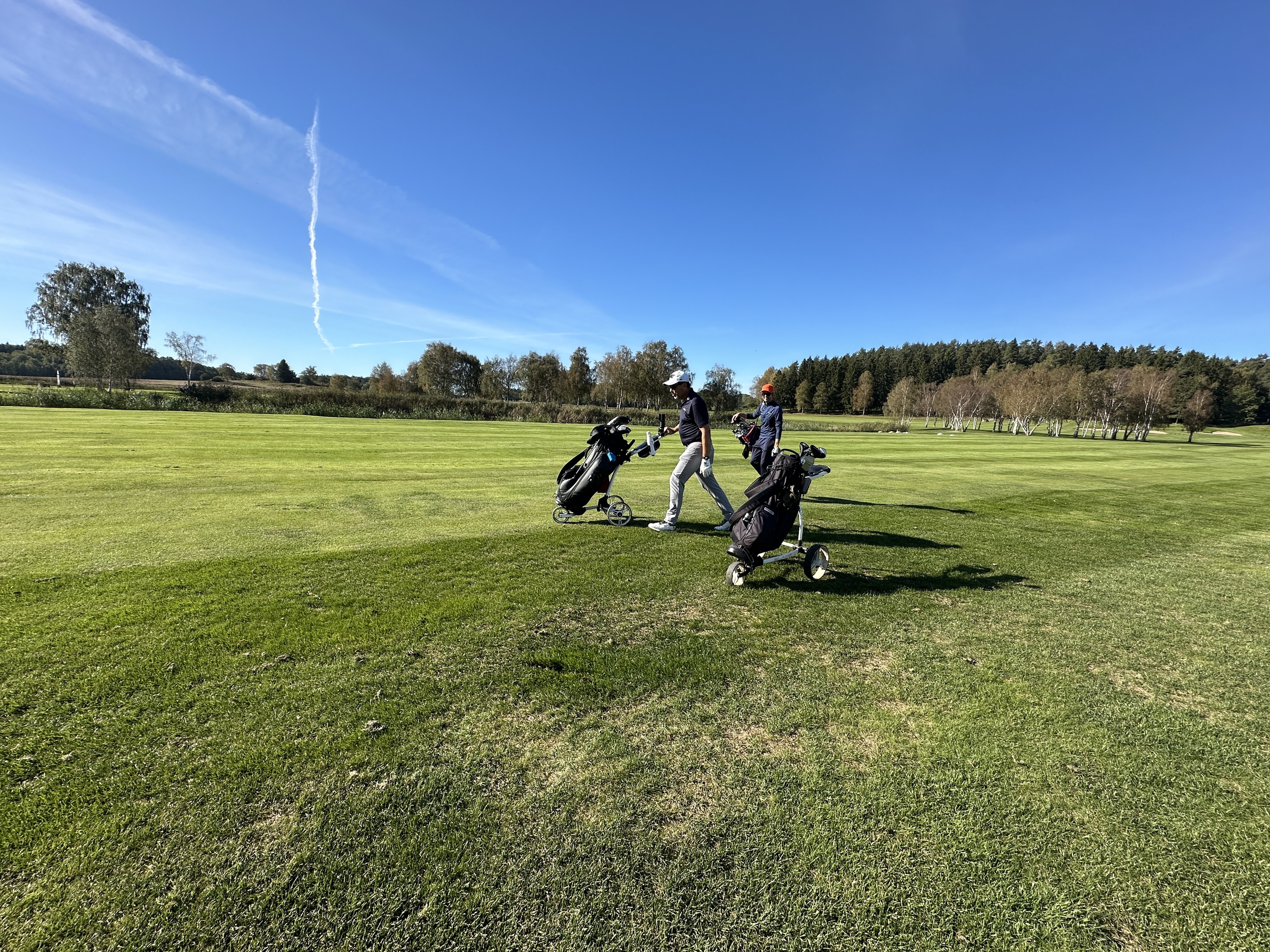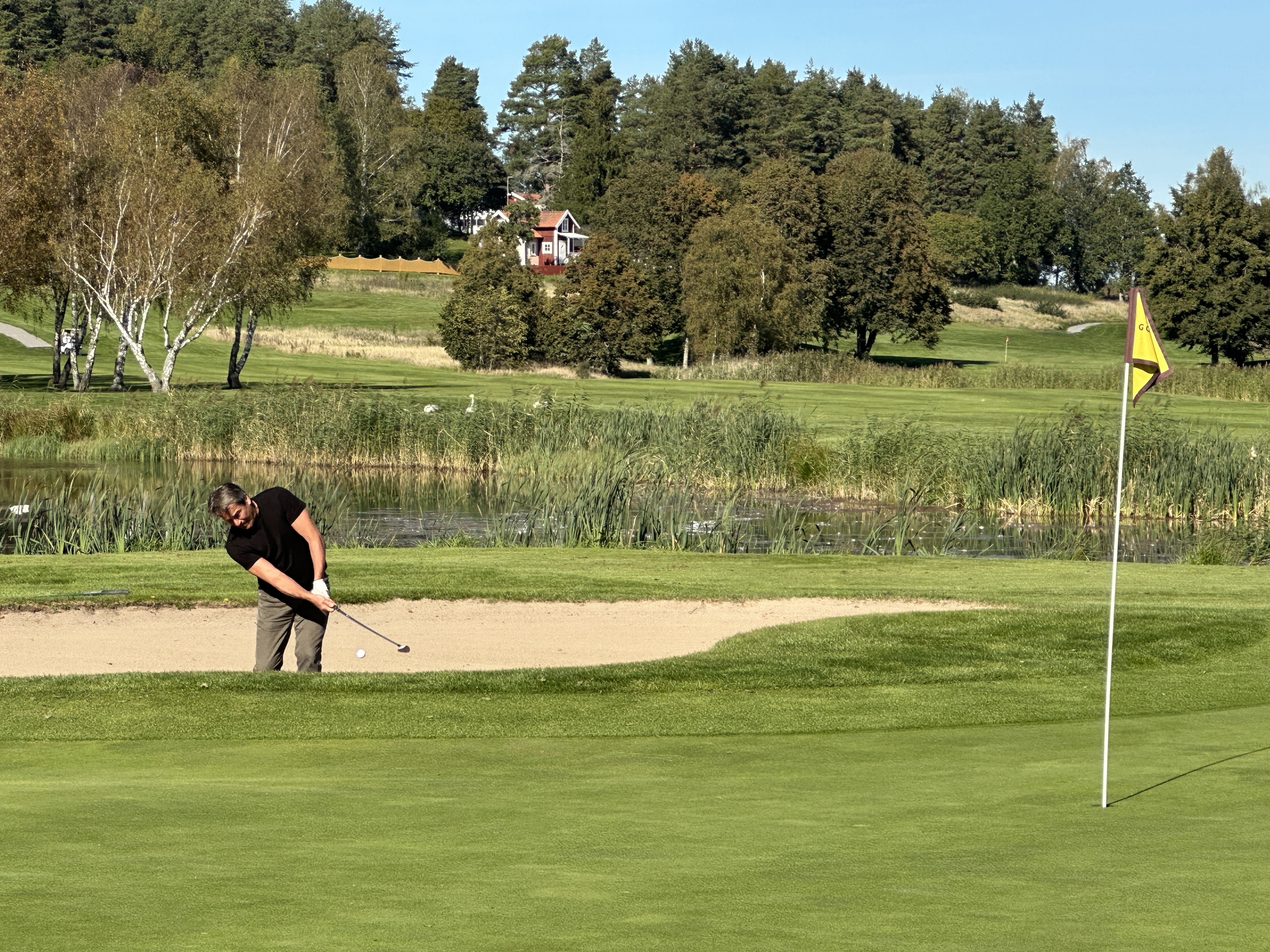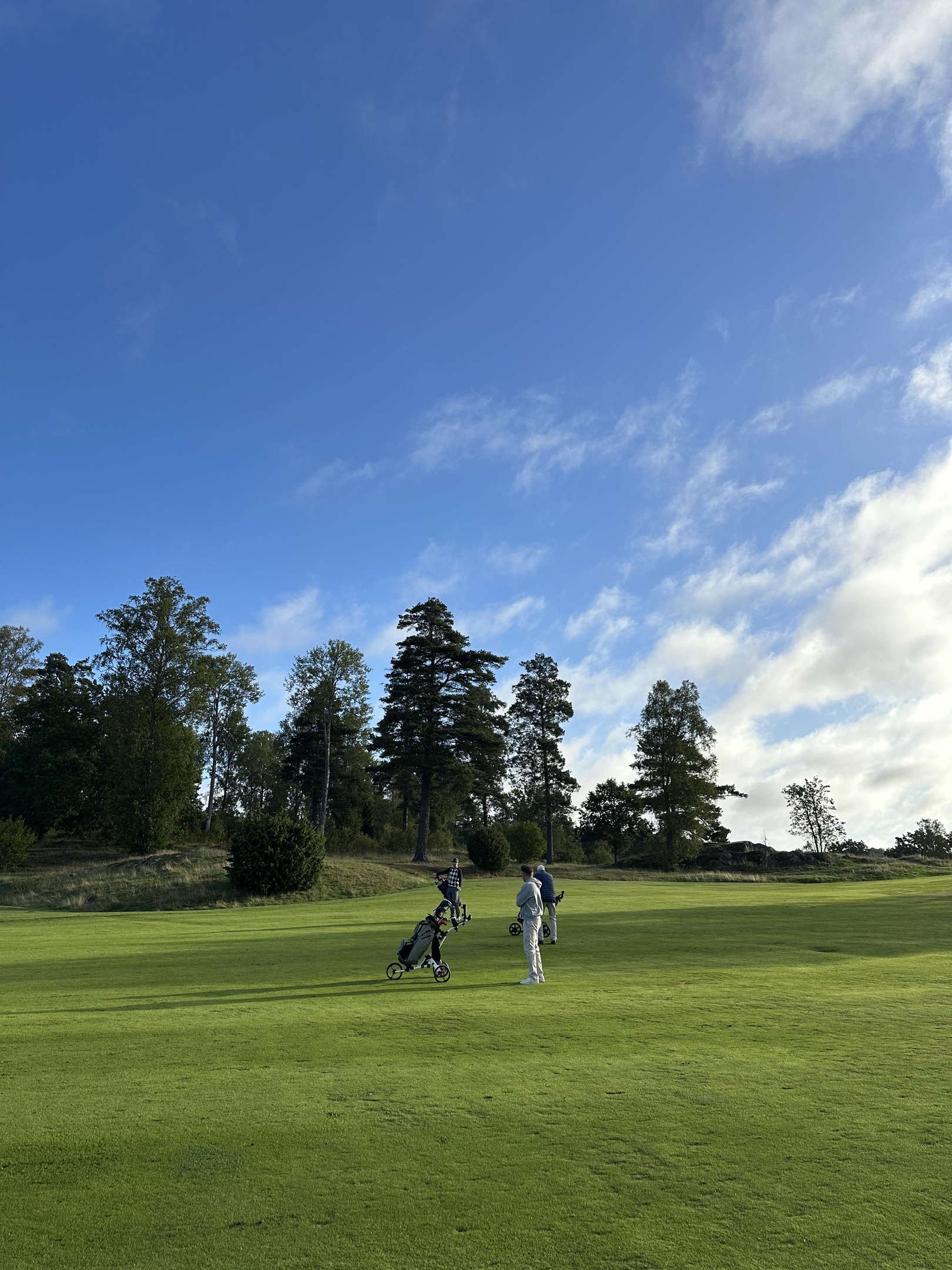 Hösten visade sig från sin allra bästa sida. Efter gårdagens regn och blåst hade banan torkat upp, solen strålade och vi kunde njuta av rundan i kortärmat. Banans skick var imponerande, både fairways och greener höll riktigt hög klass och gjorde spelupplevelsen extra rolig.
